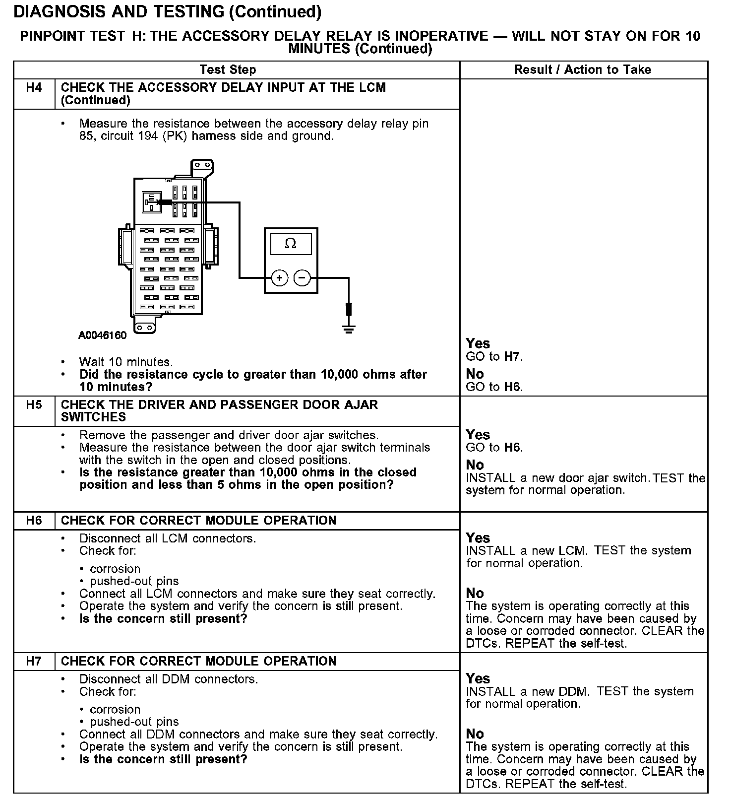 PINPOINT TEST H: THE ACCESSORY DELAY RELAY IS INOPERATIVE - WILL NOT STAY ON FOR 10 MINUTES