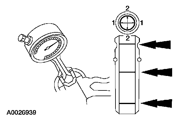 1. Measure the inner diameter of the valve guides in two directions where indicated.