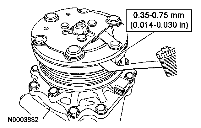 9. Measure and adjust the clutch air gap by removing or adding A/C clutch disc and hub spacers.
