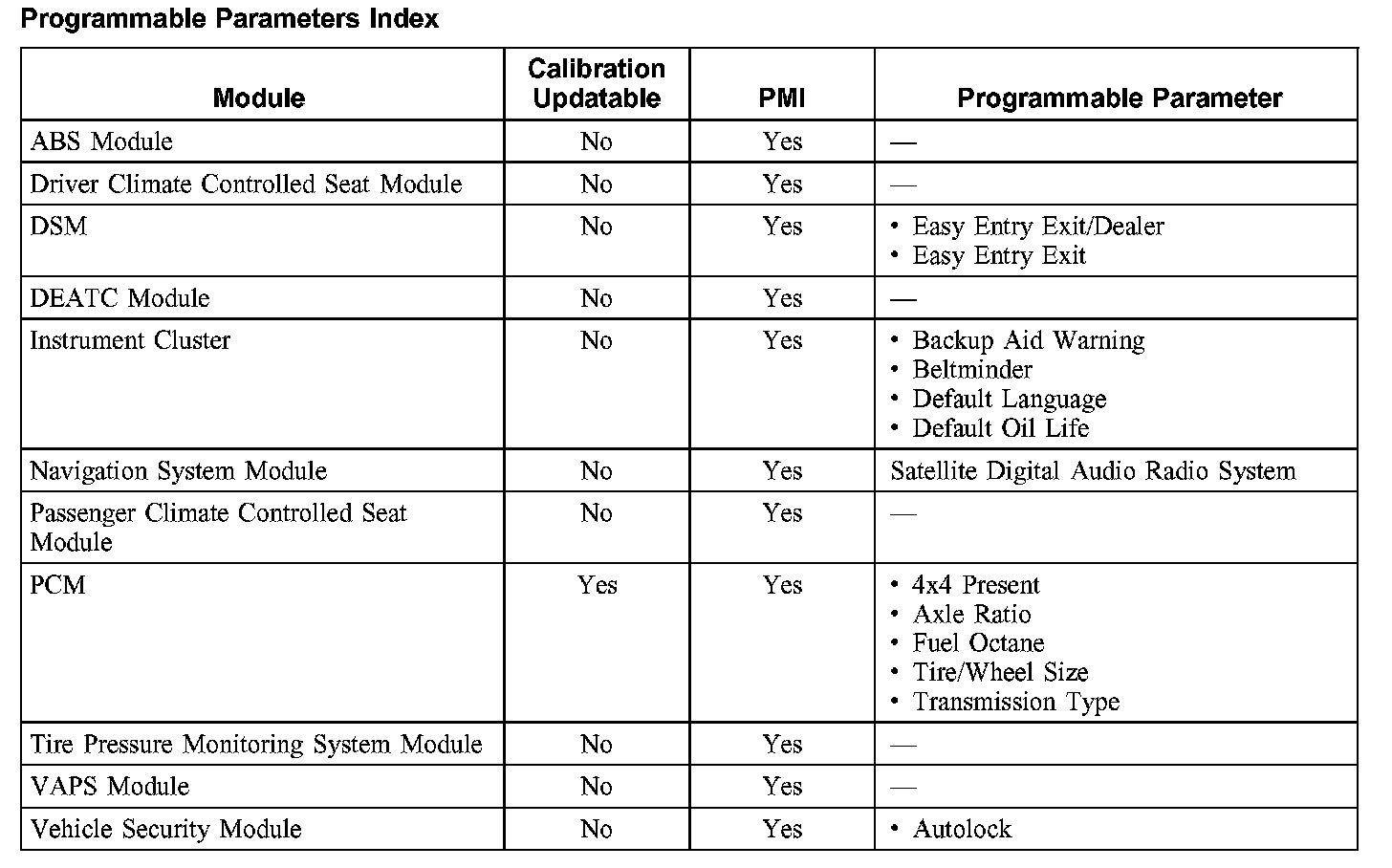If a module that has been modified using programmable parameters needs to be installed, the PMI procedure maintains the parameters in their altered state if the diagnostic tool is able to communicate with the old module during vehicle ID. Otherwise, programmable parameters may be needed to return the parameters to the altered state.