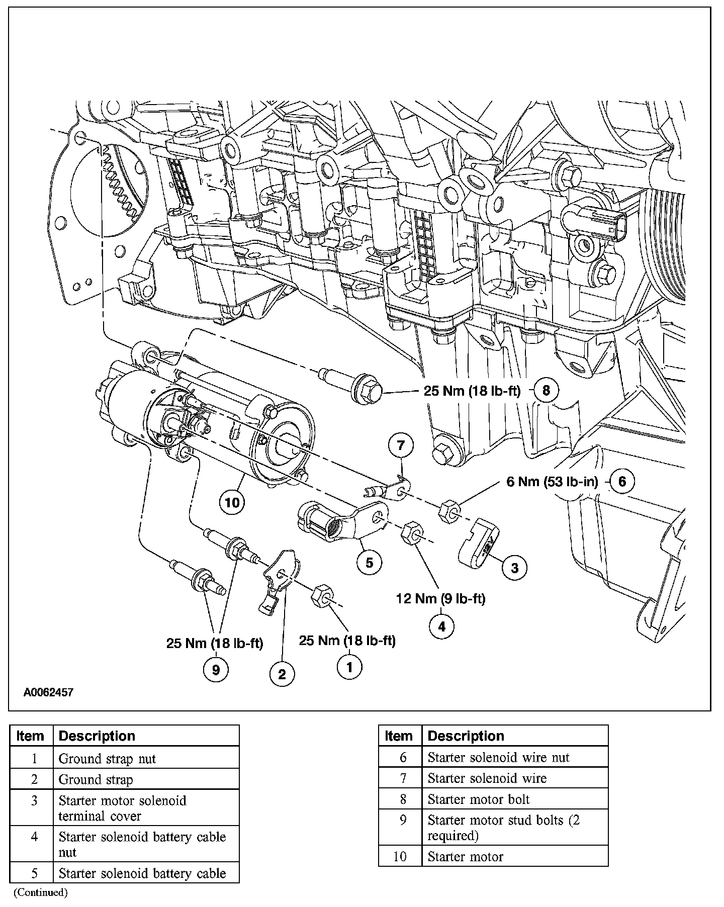 - Install the starter motor upper bolt and lower stud bolts hand-tight. Tighten the upper bolt to 25 Nm (18 lb-ft), followed by the lower stud bolts to 25 Nm (18 lb-ft).