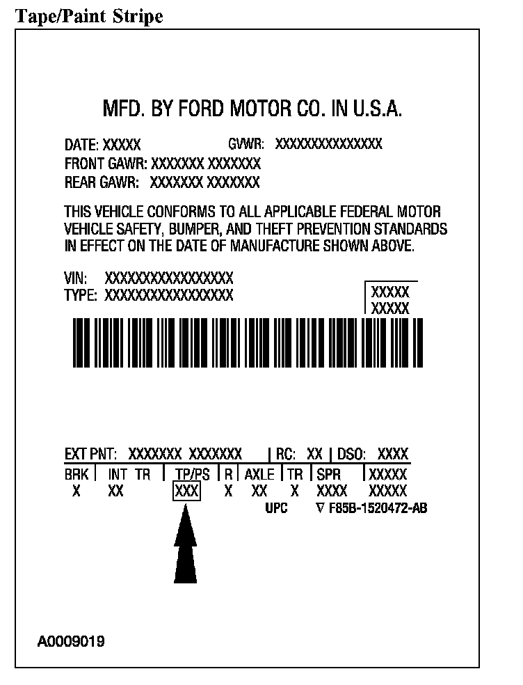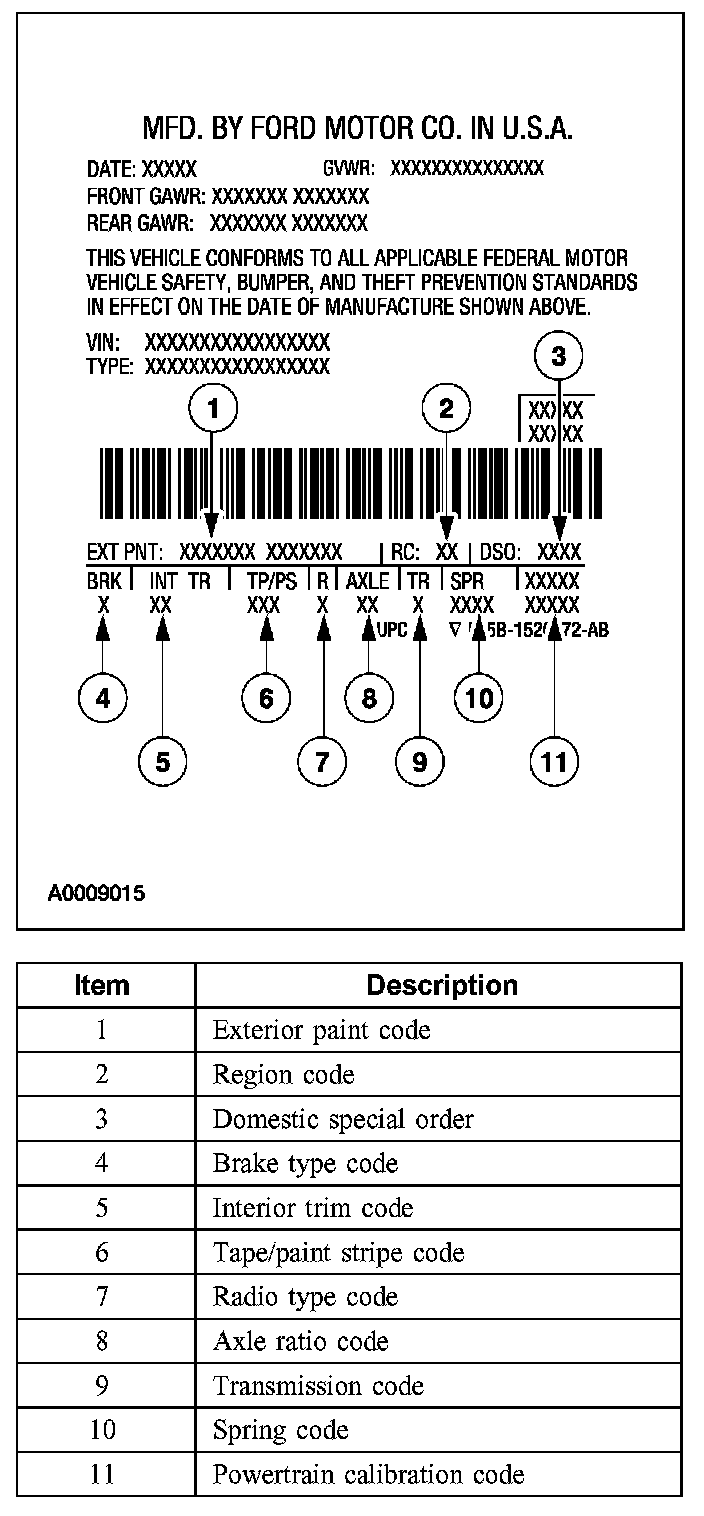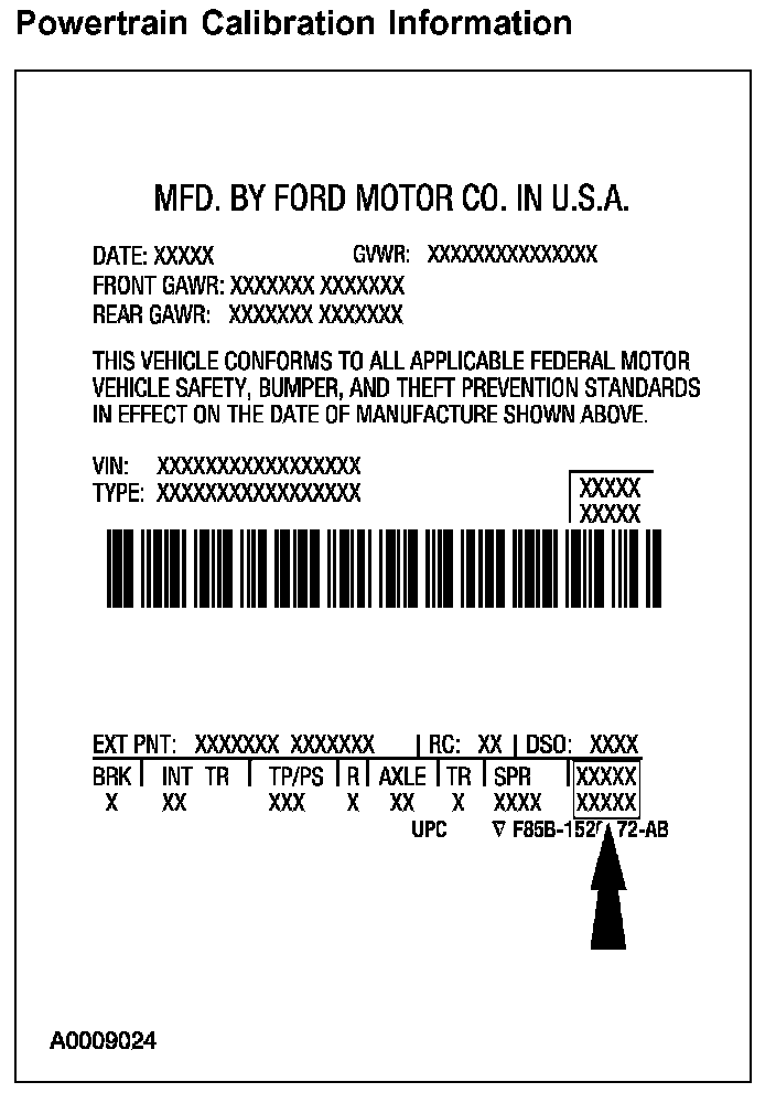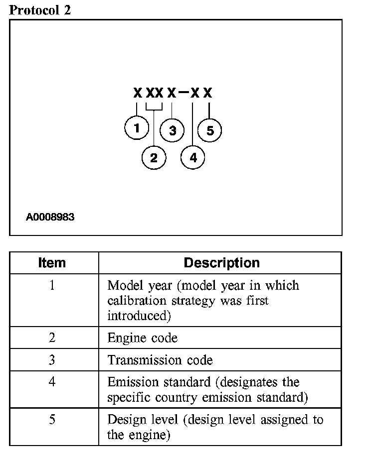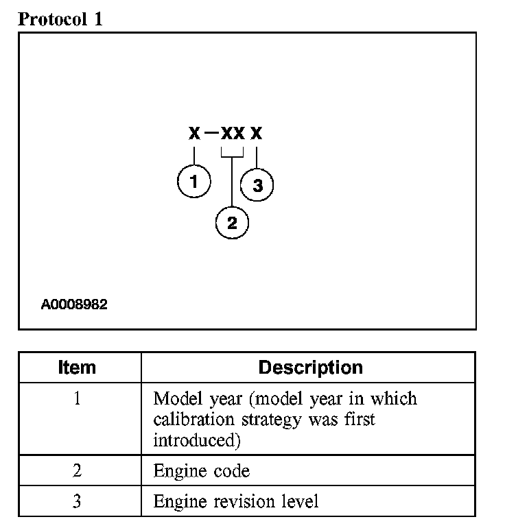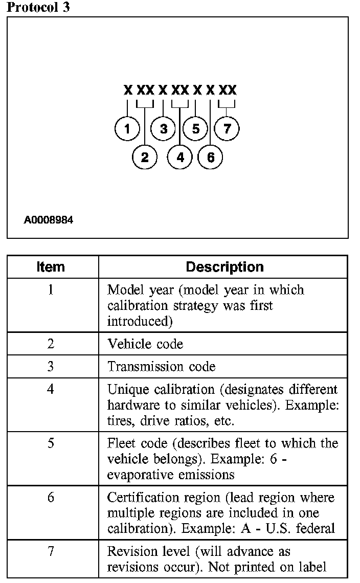 Powertrain calibration information is printed in the lower right corner of the VC label. Only base calibration information is printed. Revision levels will not appear, however, they can be found in On Line Automotive Service Information System (OASIS). For the current model year, Ford Motor Company is using 3 different protocols which describe powertrain base calibration. These protocols are designed to provide worldwide standardization for vehicle calibration. If the electronic calibration strategy was introduced in 1998 and carried into the current model year, Protocol 1 will be used. Refer to Protocol 1. If the electronic calibration strategy was introduced in 1999 and carried into the current model year, Protocol 2 will be used. Refer to Protocol 2. For electronic calibration strategy introduced in 2000 and beyond, Protocol 3 will be used. Refer to Protocol 3.