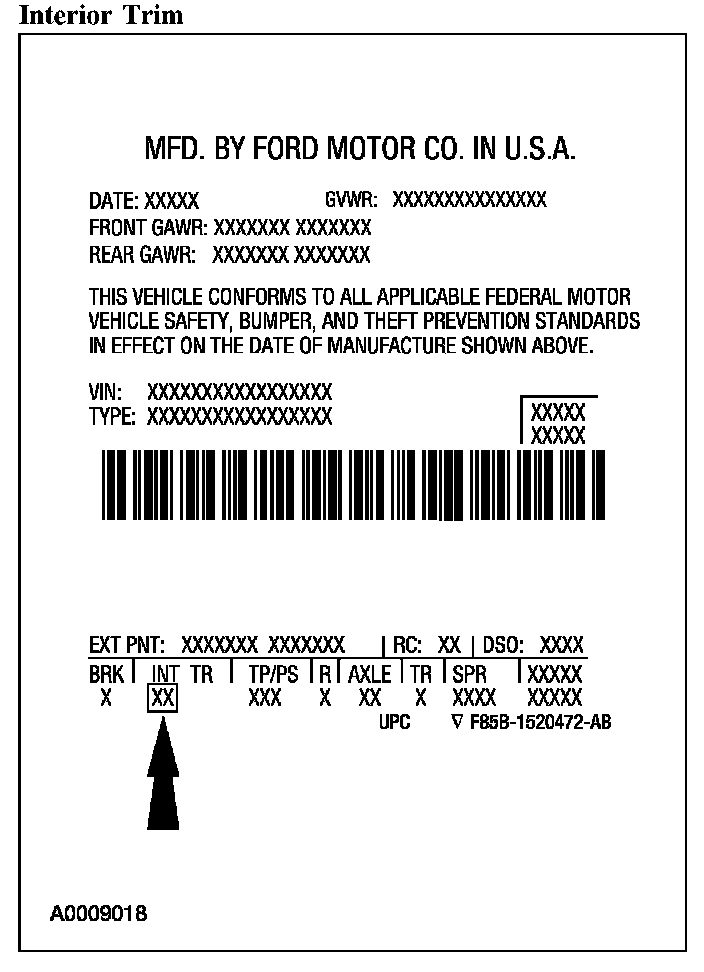 Interior trim codes are listed as a 2-part code. The first character identifies the interior trim type. The second character identifies the interior trim color.