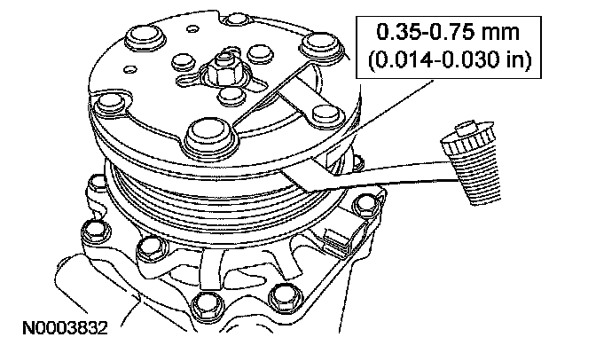 11. Measure and adjust the clutch air gap by removing or adding A/C clutch disc and hub spacers.