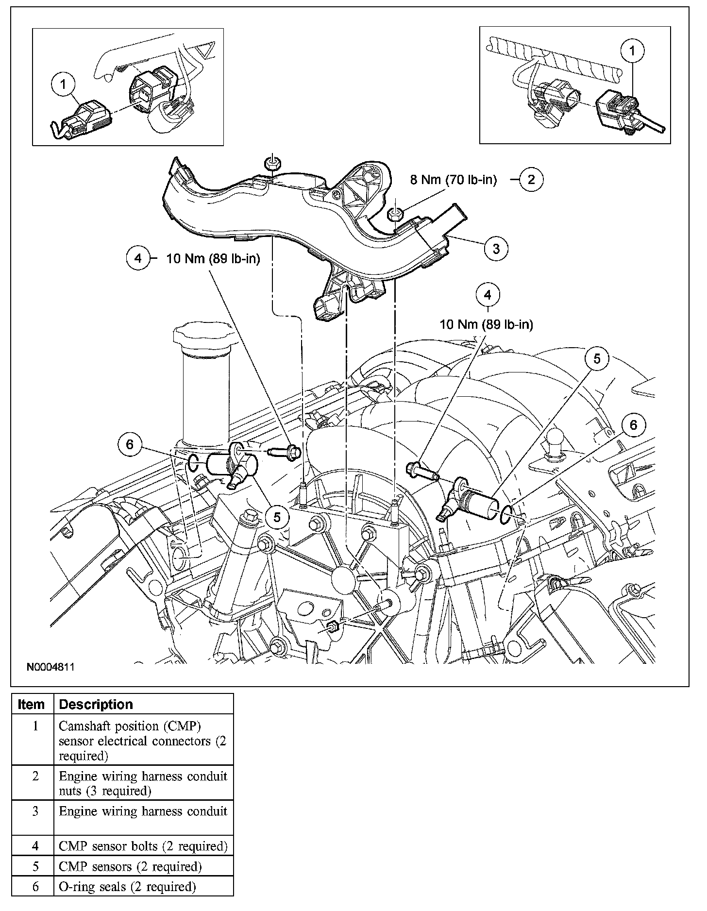6. Remove the 2 bolts and the LH and RH CMP sensors.