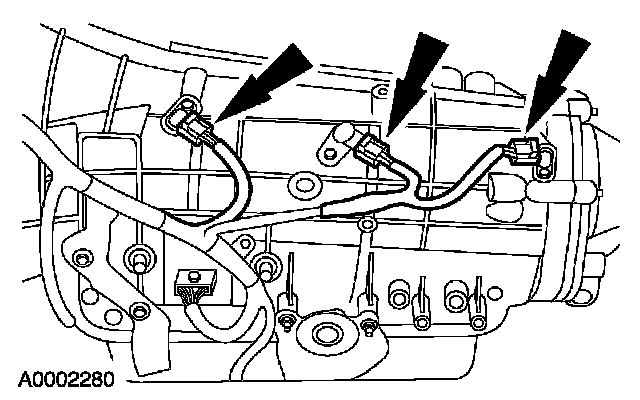 13. Lower the transmission enough to gain access to the sensors. Disconnect the turbine shaft speed (TSS) sensor, output shaft speed (OSS) sensor and intermediate shaft speed (ISS) sensor electrical connectors.