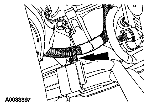6. Disconnect the heated oxygen sensor connector and remove the sensor wire retaining clip from the right side of the transmission pan rail.