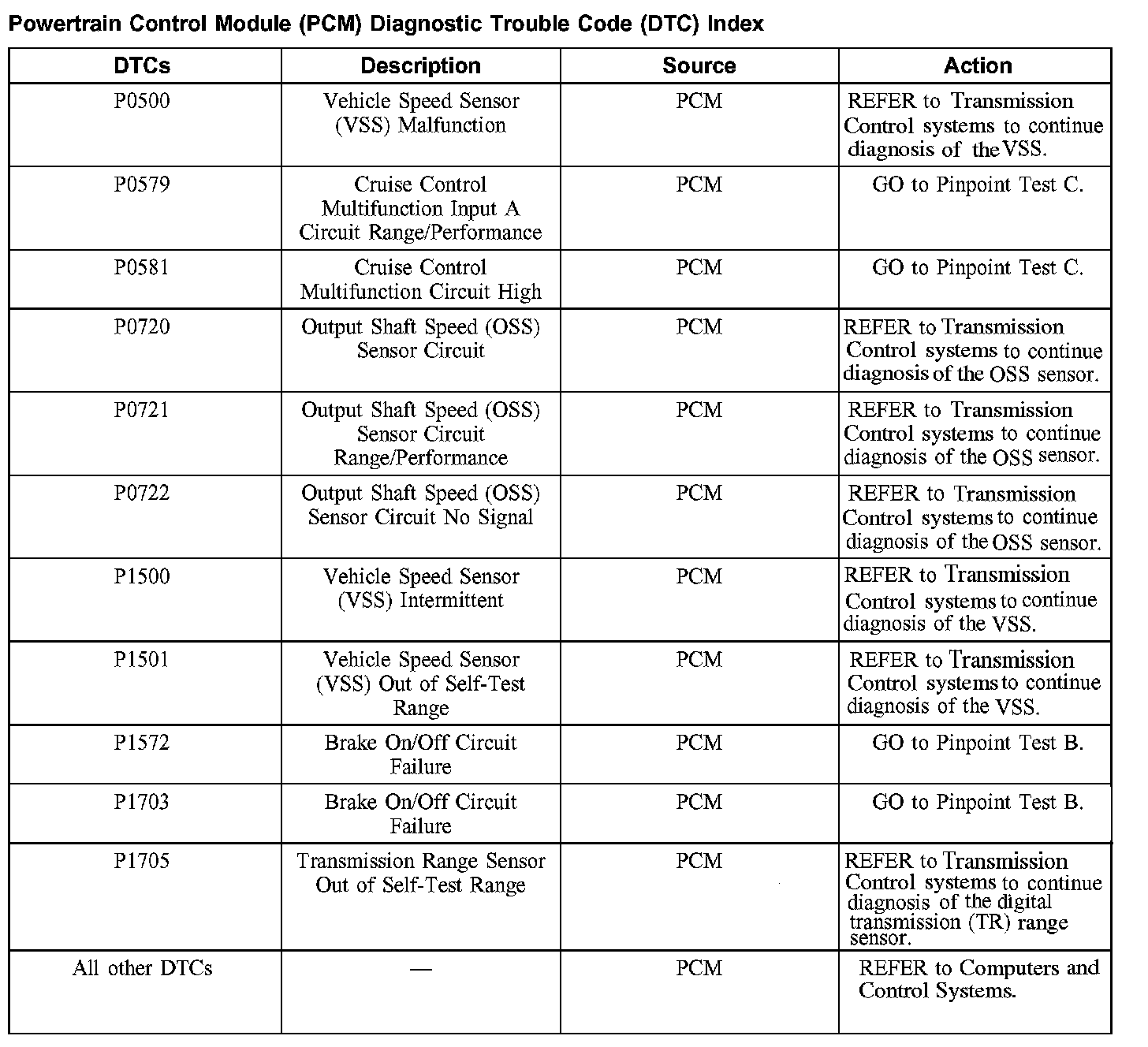 Powertrain Control Module (PCM) Diagnostic Trouble Code (DTC) Index