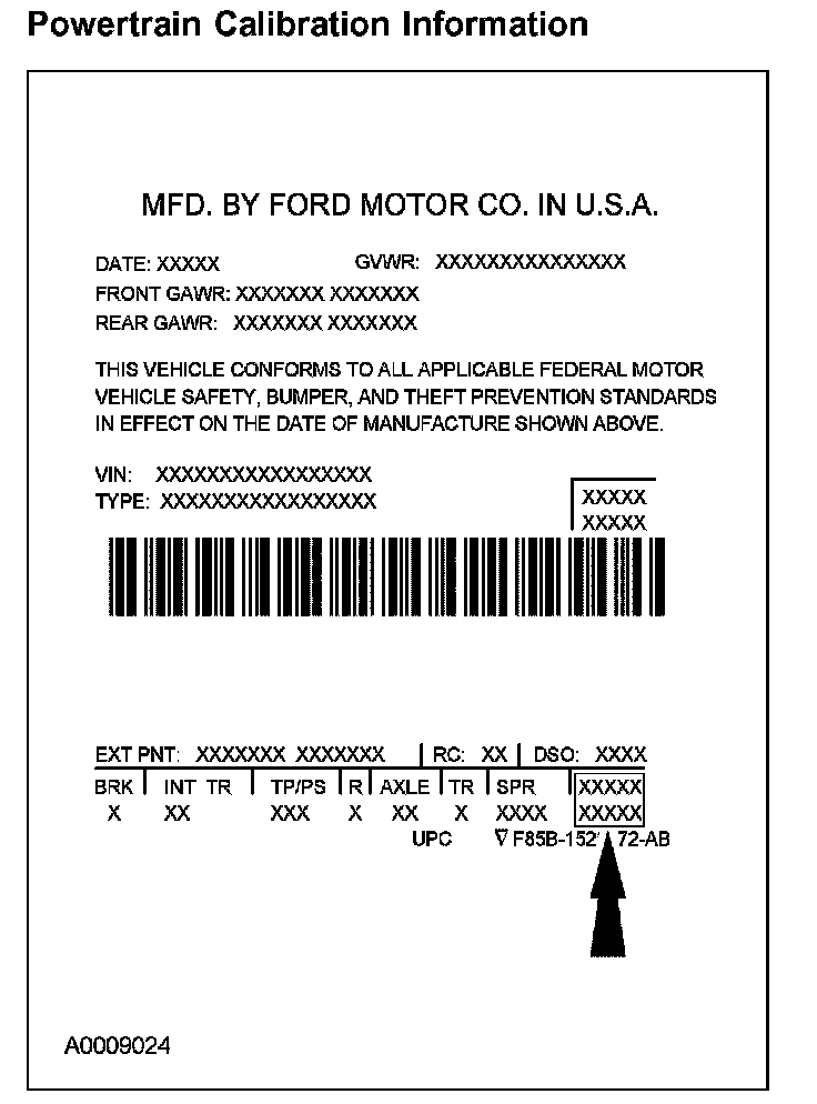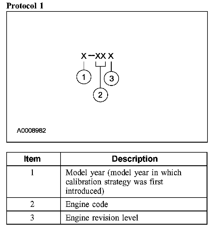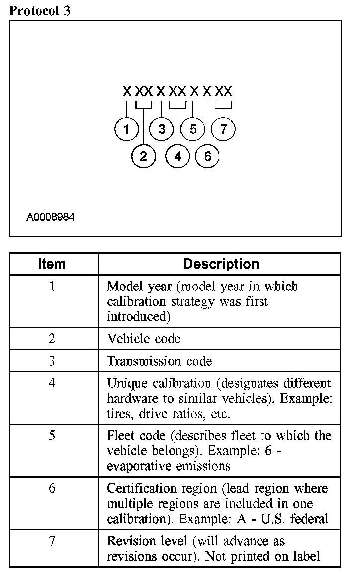 Powertrain calibration information is printed in the lower right corner of the VC label. Only base calibration information is printed. Revision levels will not appear, however, they can be found in On Line Automotive Service Information System (OASIS). For the current model year, Ford Motor Company is using 3 different protocols which describe powertrain base calibration. These protocols are designed to provide worldwide standardization for vehicle calibration. If the electronic calibration strategy was introduced in 1998 and carried into the current model year, Protocol 1 will be used. Refer to Protocol 1. If the electronic calibration strategy was introduced in 1999 and carried into the current model year, Protocol 2 will be used. Refer to Protocol 2. For electronic calibration strategy introduced in 2000 and beyond, Protocol 3 will be used. Refer to Protocol 3.