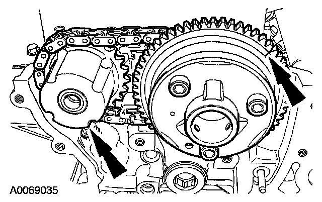 ^ Position the crankshaft gear in the timing chain.
