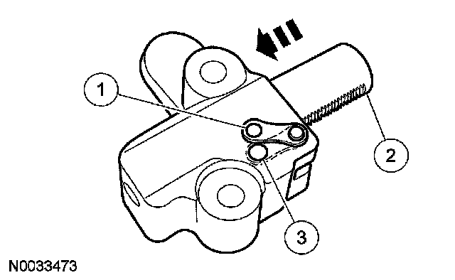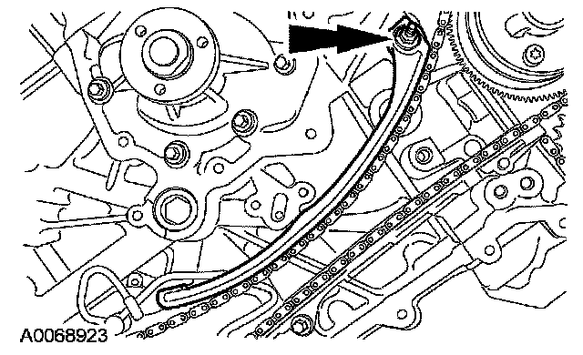 35. Install the LH timing chain tensioner. Install the timing chain tensioner and bolts, and remove the drill rod.