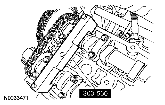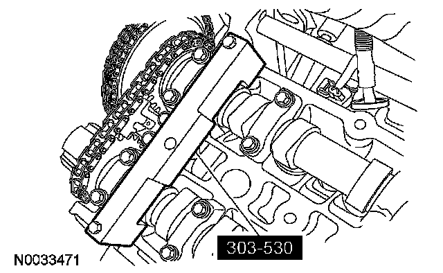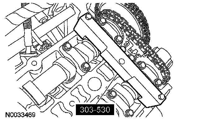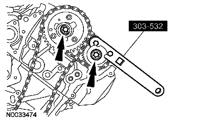 CAUTION: Using the special tool, apply 10 Nm (89 inch lbs.) counterclockwise to the LH exhaust camshaft sprocket.