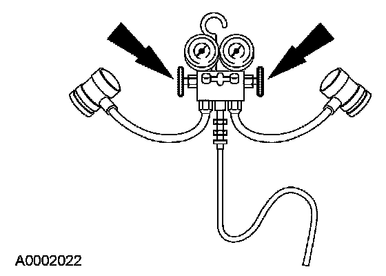 1. Turn both valves on the R-134a Manifold Gauge Set clockwise to close the low- and high-pressure hoses to the center manifold and center hose.