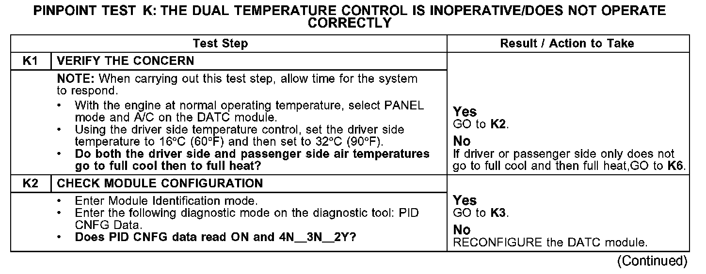 PINPOINT TEST K: THE DUAL TEMPERATURE CONTROL IS INOPERATIVE/DOES NOT OPERATE CORRECTLY