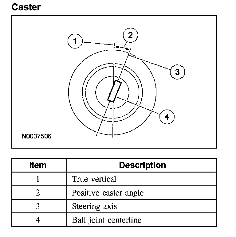 Caster is the deviation from vertical of an imaginary line drawn through the ball joints when viewed from the side. The caster specifications will give the vehicle the best directional stability characteristics when loaded and driven. The caster setting is not related to tire wear.