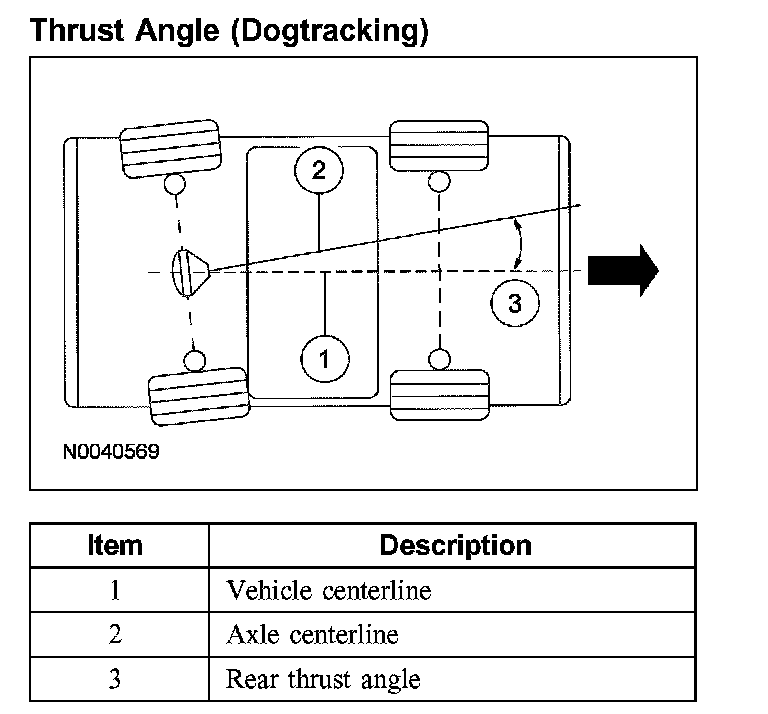 Incorrect rear thrust angle (also known as dogtracking) is the condition in which the independent rear suspension (IRS) system is not square to the chassis. Heavily crowned roads can give the illusion of dogtracking.
