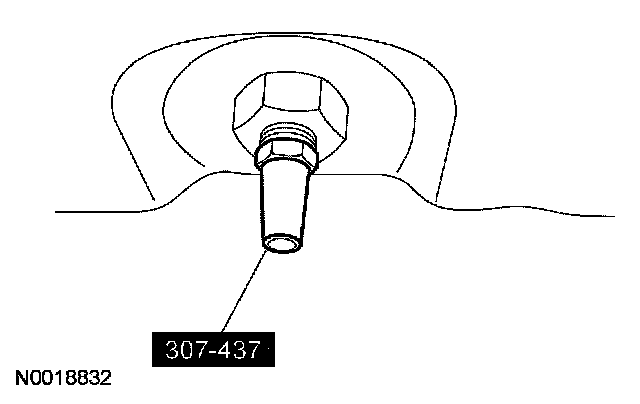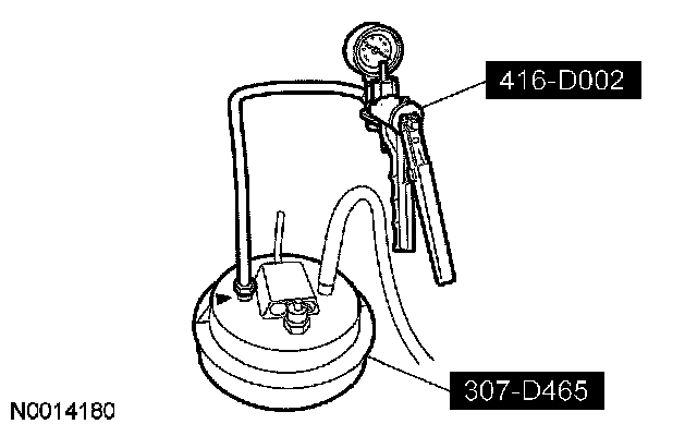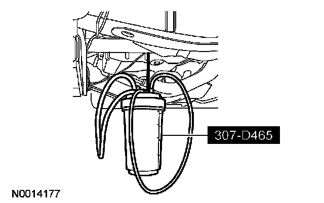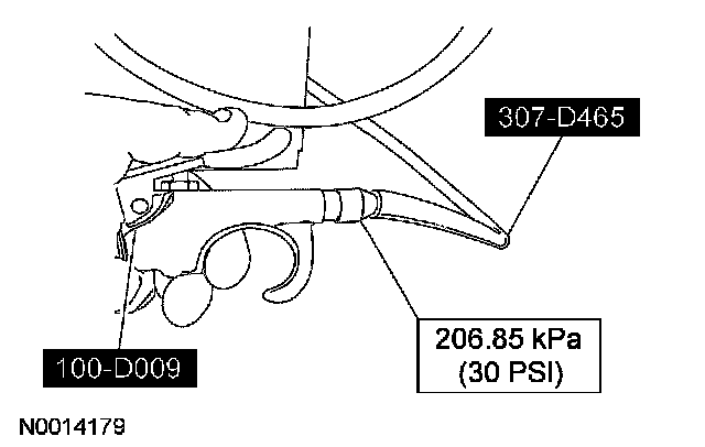 12. Apply a maximum of 206.85 kPa (30 psi) to the open end of the vacuum/pressure hose from the special tool. Fluid will immediately start flowing out of the special tool into the transmission fluid pan.