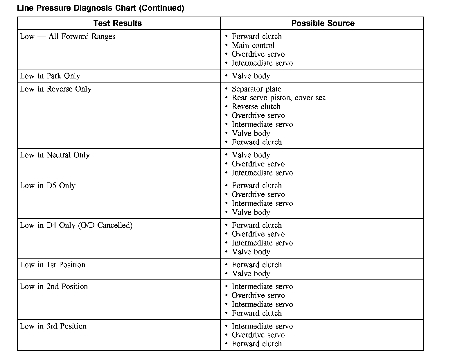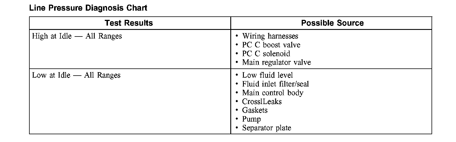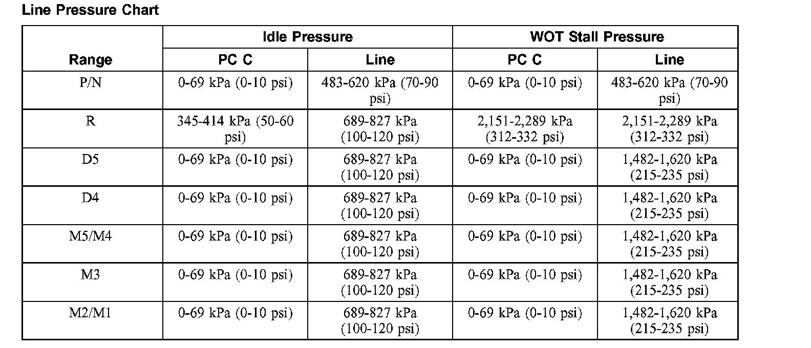Line Pressure TestCAUTION: Carry out Line Pressure Test prior to carrying out Stall Speed Test. If line pressure is low at stall, do not carry out the Stall Speed Test or further transmission damage will occur. Do not maintain wide open throttle (WOT) in any gear range for more than 5 seconds.