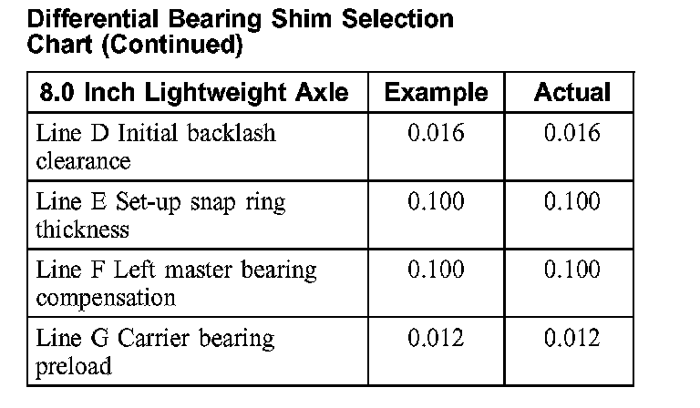 To determine the bearing shim thickness, add lines A, F and G. Subtract line C and D from the sum. Example: