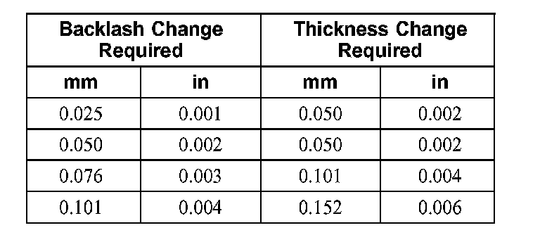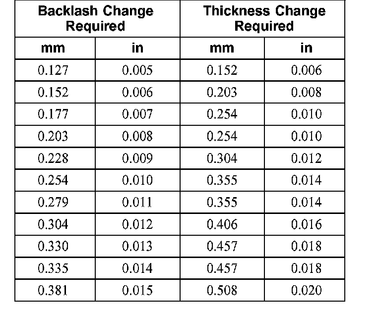 ^ Turn the differential ring gear without turning the differential pinion gear. Record the indicator reading. The allowable backlash is 0.127 mm (0.005 inch) to 0.228 mm (0.009 inch) and must not vary more than 0.076 mm (0.003 inch) between points measured. A backlash variation of more than 0.076 mm (0.003 inch) between points checked indicates gear/case runout.