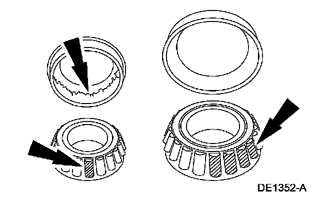 As noted, pinion bearings make a high-pitched, whistling noise, usually at all speeds. If however there is only one pinion bearing that is worn/damaged, the noise may vary in different driving phases. New pinion bearings must not be installed unless they are scored or damaged or there is a specific pinion bearing noise. A worn/damaged bearing will normally be obvious at disassembly. Examine the large end of the rollers for wear. If the pinion bearings original blend radius has worn to a sharp edge, a new pinion bearing must be installed.