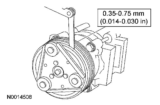 7. Measure and adjust the clutch air gap by adding or removing A/C clutch disc and hub spacers.