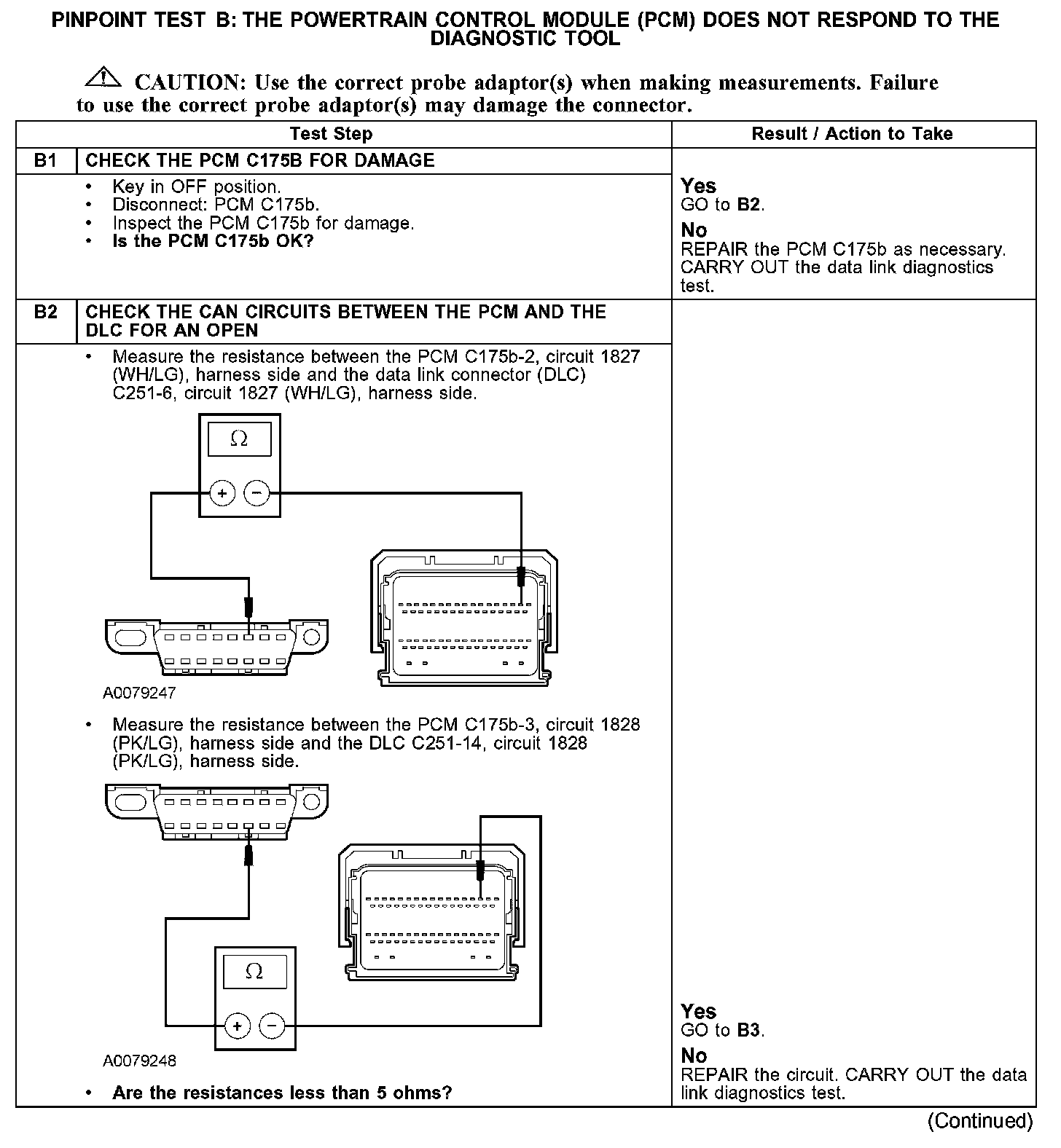 Check the CAN circuits between the PCM C175b and the data link connector (DLC) C251. The total resistance values must not be more than 5 ohms. If the resistance is more than 5 ohms there is an open in circuit 1827 (WH/LG) and 1828 (PK/LG), damage to the DLC C251, damage to the PCM C175b, or a problem with the in-line connector.