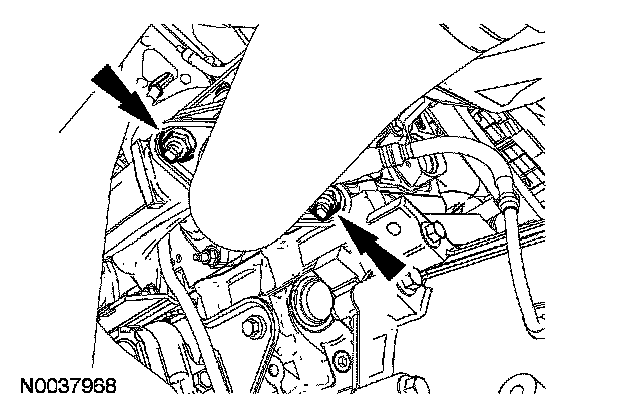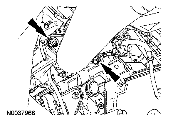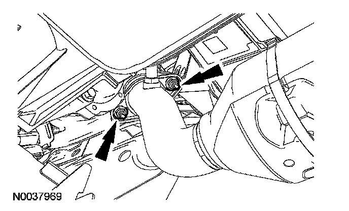 13. Remove the exhaust Y-pipe-dual catalytic converter hanger bracket and isolator bolts.