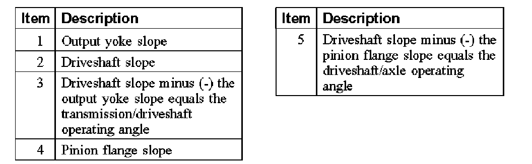 ^ When 2 connected components slope in the same direction, subtract the smaller number from the largest to find the U-joint operating angle. When 2 connected components slope in the opposite direction, add the measurements to find the U-joint operating angle.