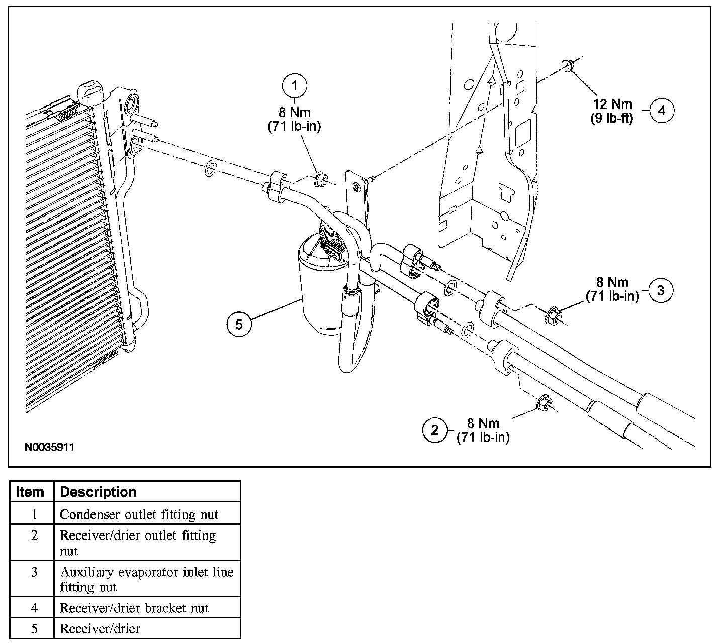 NOTE: Installation of a new receiver/drier is not required when repairing the air conditioning system except when there is physical evidence of contamination from a failed A/C compressor or damage to the receiver/drier.