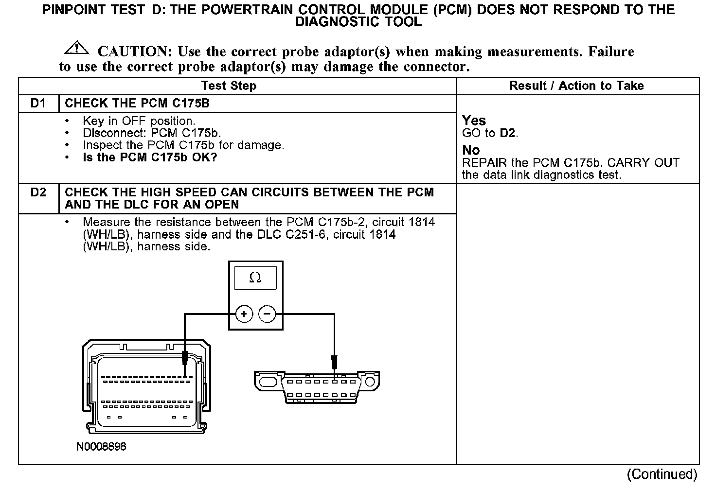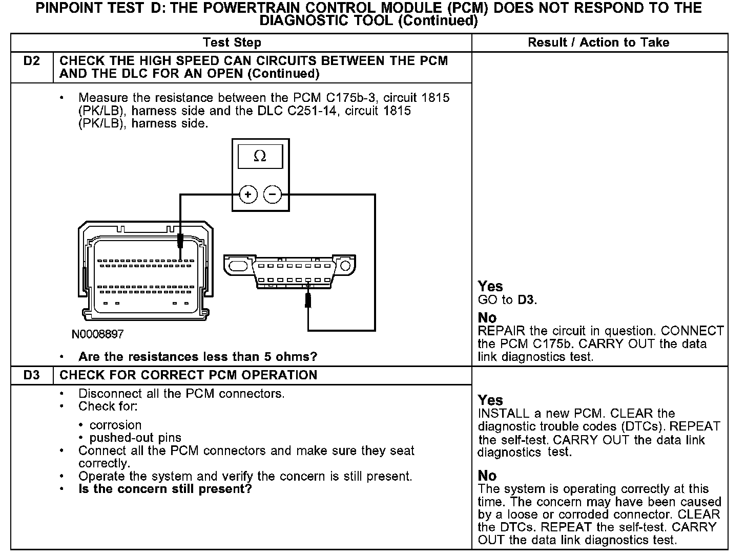 The PCM communicates with the diagnostic tool through the high speed controller area network (CAN), circuits 1814 (WH/LB) and 1815 (PK/LB). Check the high speed CAN circuits 1814 (WH/LB) and 1815 (PK/LB) between the PCM C175b and the data link connector (DLC) C251. The total resistance values must not be more than 5 ohms. If the resistance is more than 5 ohms there is an open in one of the CAN circuits, damage to the DLC C251, damage to the PCM C175b, or a problem in an in-line connector.