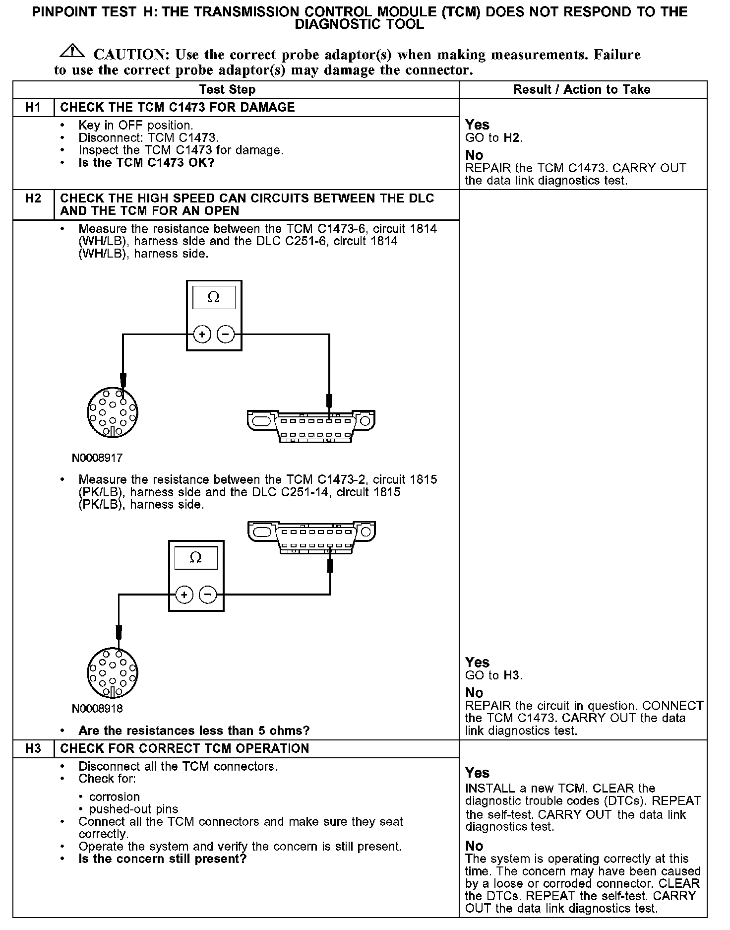 The TCM communicates with the diagnostic tool through the high speed controller area network (CAN), circuits 1814 (WH/LB) and 1815 (PK/LB). Check the high speed CAN circuits 1814 (WH/LB) and 1815 (PK/LB) between the TCM C1473 and the data link connector (DLC) C251. The total resistance values must not be more than 5 ohms. If the resistance is more than 5 ohms there is an open in one of the CAN circuits, damage to the DLC C251, damage to the TCM C1473, or a problem in an in-line connector.