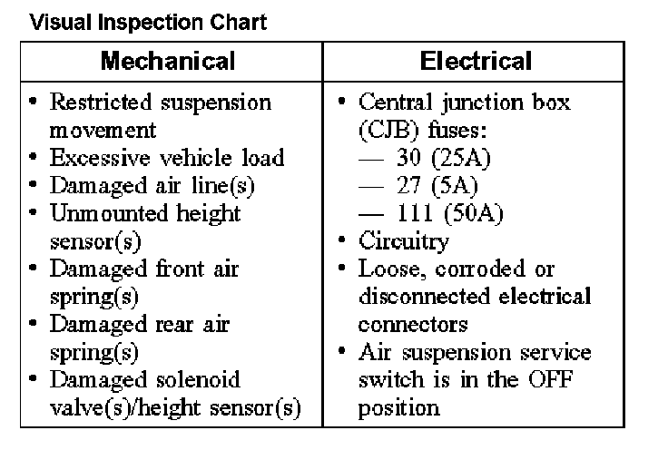 2. NOTE: If the door ajar indicator is illuminated when all doors, the liftgate and the liftgate glass are closed, the air suspension will not work correctly. Repair the door ajar indicator. Refer to Instrument Panel, Gauges and Warning Indicators.