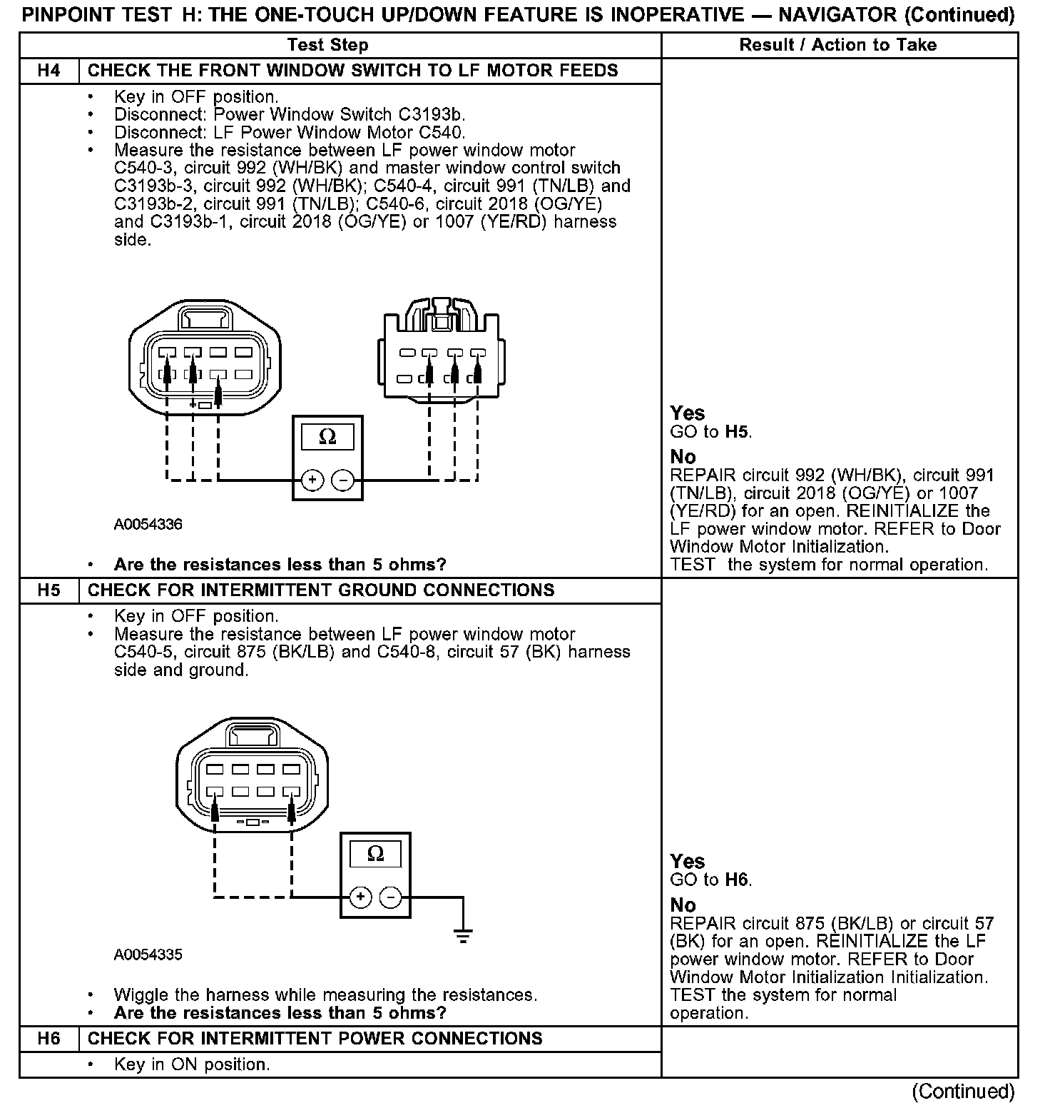 Under normal operation, the LF power window motor microprocessor receives power at all times through circuit 1523 (DG) and from the accessory delay relay through circuit 194 (PK). Ground is provided at all times through circuit 57 (BK) and 875 (BK/LB). The master window control switch provides voltage input to the power window motor microprocessor through circuit 991 (TN/LB) and ground through circuit 992 (WH/BK) to operate the driver window down, and voltage input through circuit 992 (WH/BK) and ground through circuit 991 (TN/LB) to operate the driver window up. To operate the one-touch feature, the master window control switch provides a ground input to the LF power window motor microprocessor through circuit 2018 (OG/YE) in addition to the up or down request.
