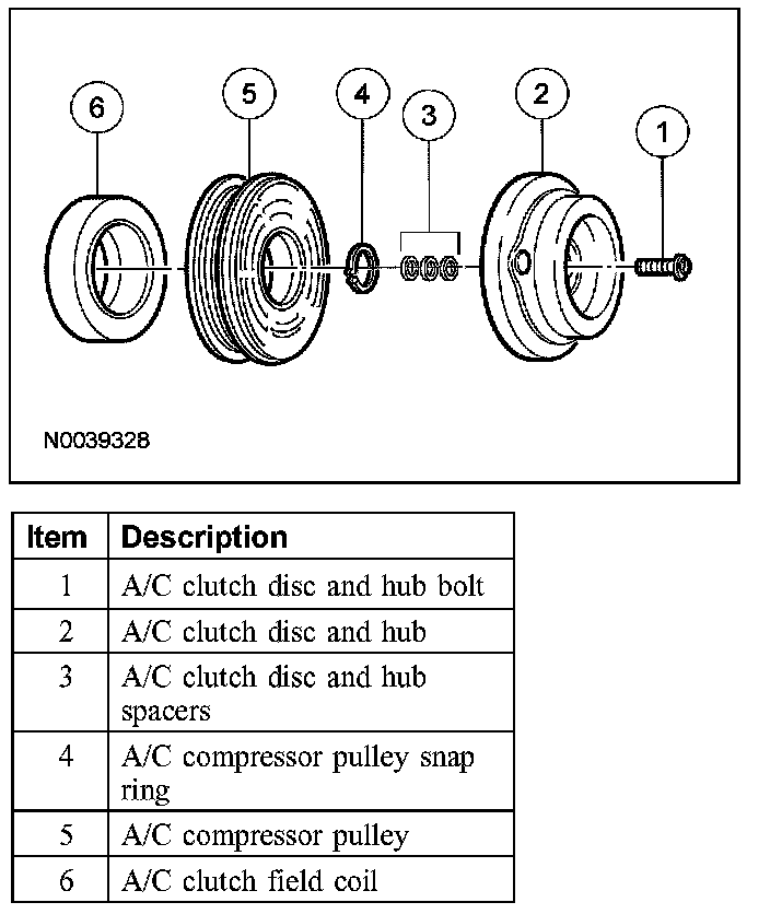 NOTE: If installing a new A/C compressor, the A/C clutch components should be reused unless obvious signs of damage are found. If excessive grooving is found, a new A/C clutch disc and hub and A/C compressor pulley must be installed together. Otherwise, each component can be installed individually where needed.