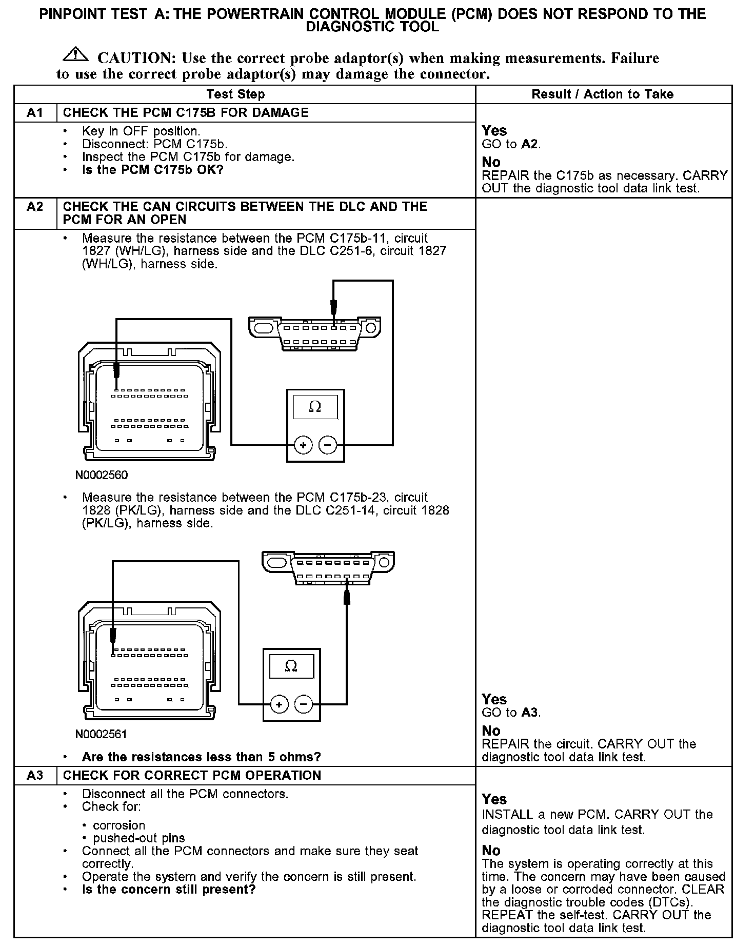 The PCM communicates with the diagnostic tool through the controller area network (CAN), circuits 1827 (WH/LG) and 1828 (PK/LG). The total resistance values must not be more than 5 ohms. If the resistance is more than 5 ohms, there is either an open in the CAN circuits, damage to the DLC C251, damage to the PCM C175b, or a problem in the in-line connector.