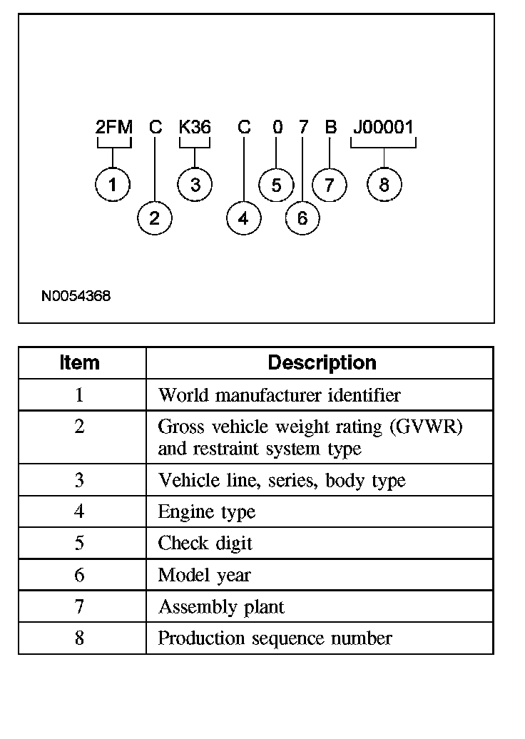 The vehicle identification number (VIN) is a 17-digit combination of letters and numbers. The VIN is stamped on a metal tab riveted on the instrument panel, top upper left of the dash. The VIN is also found on the vehicle certification (VC) label.