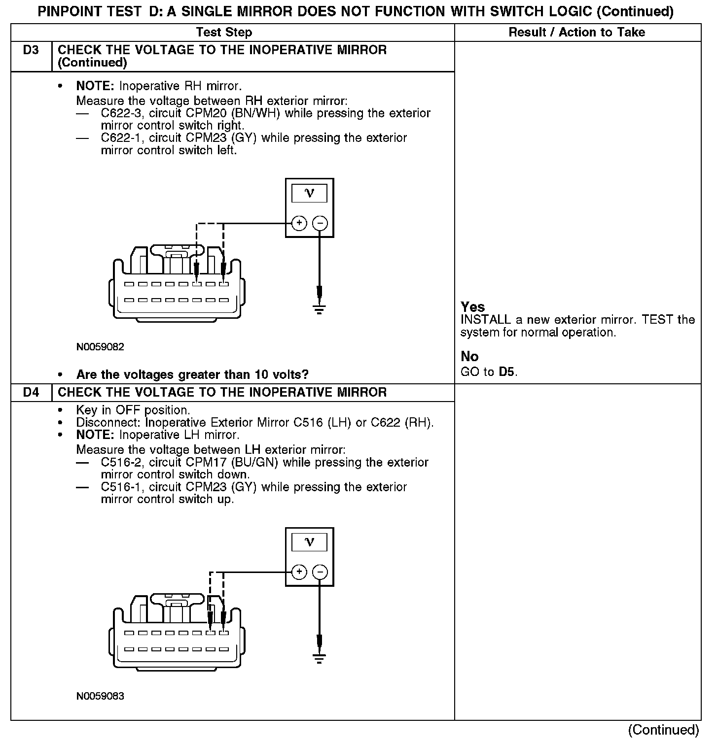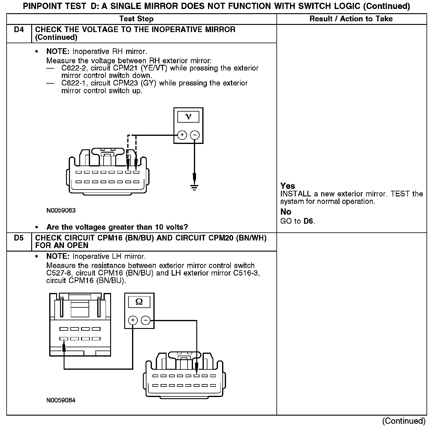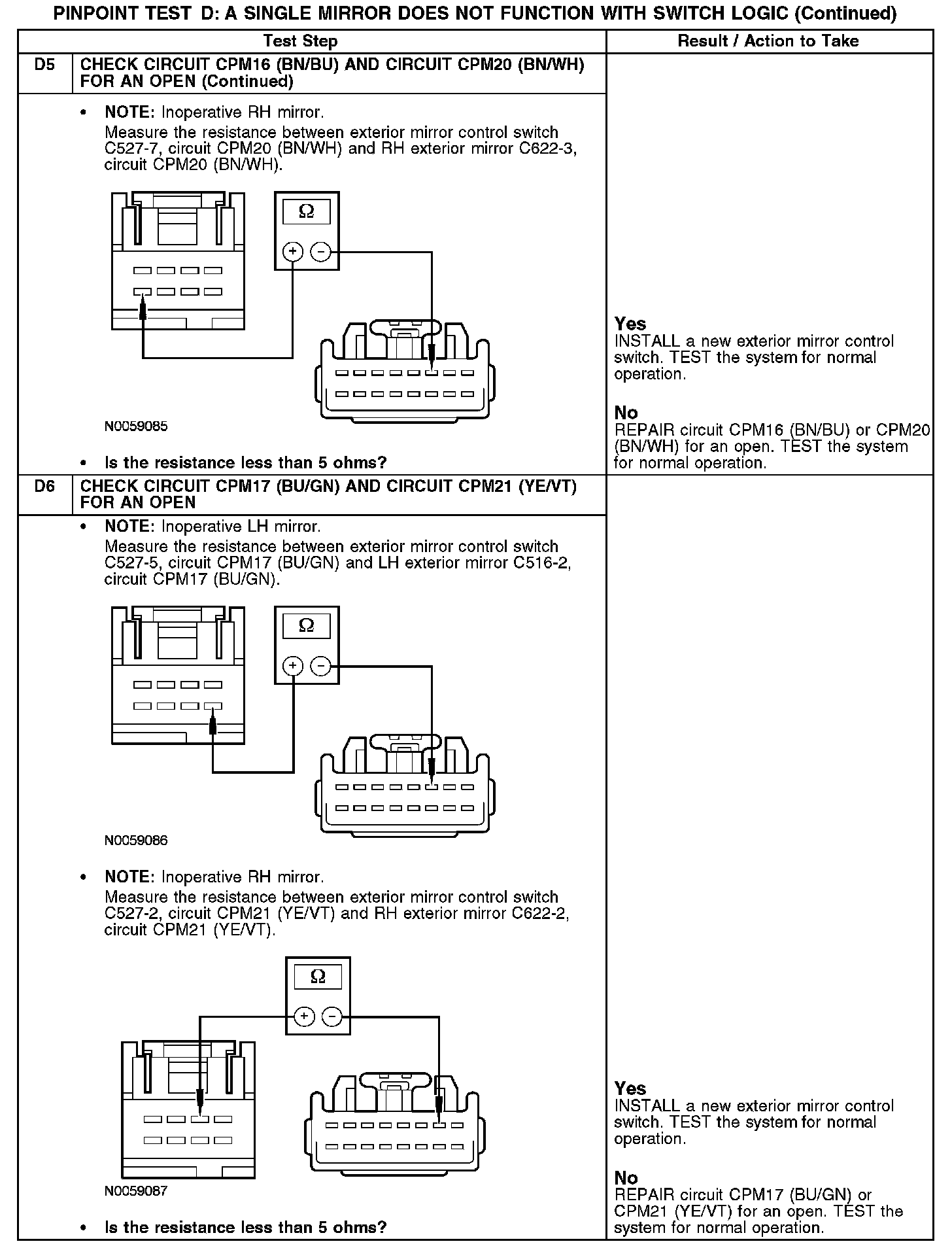 - When ground is received through circuit CPM16 (BN/BU) or CPM20 (BN/WH) and power through circuit CPM23 (GY), the LH or RH exterior mirror glass will move right.