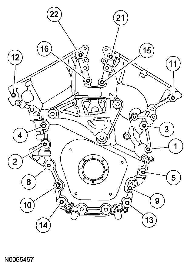56. NOTE: The remainder of the engine front cover bolts (1, 2, 3, 4, 5, 6, 9, 10, 11, 12, 13, 14, 15, 16, 21 and 22) must be installed and tightened within 60 minutes of the initial sealant application.