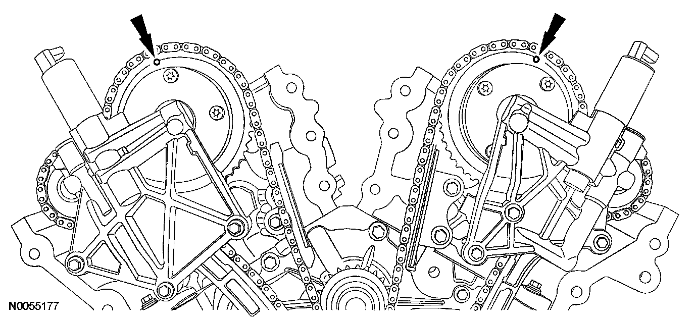 86. Rotate the crankshaft clockwise and align the timing marks on the VCT assemblies as shown.