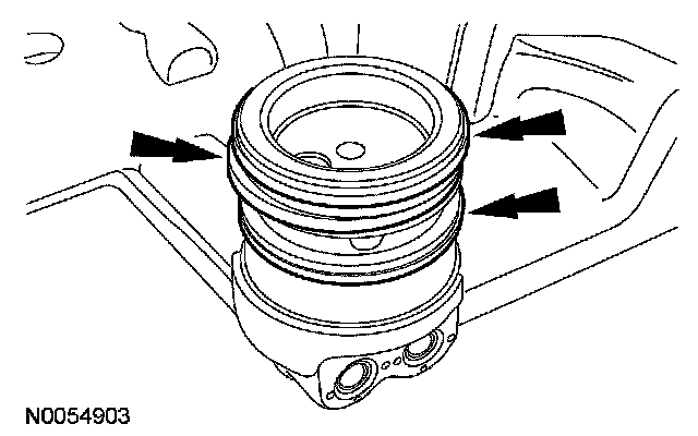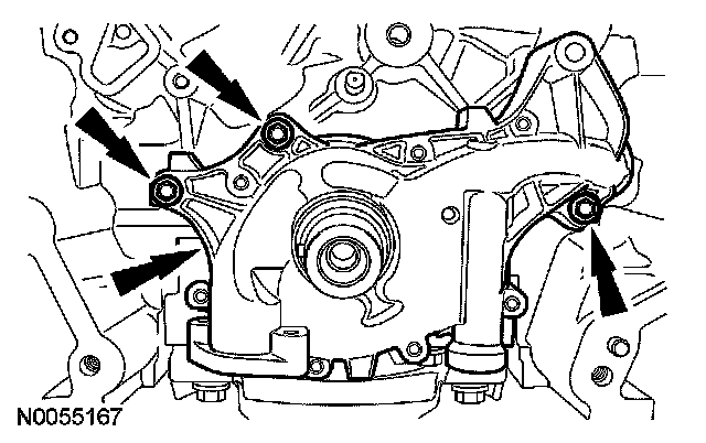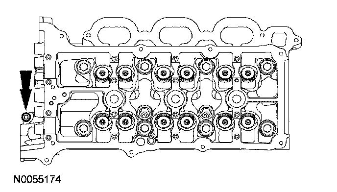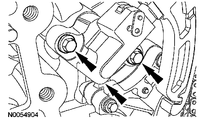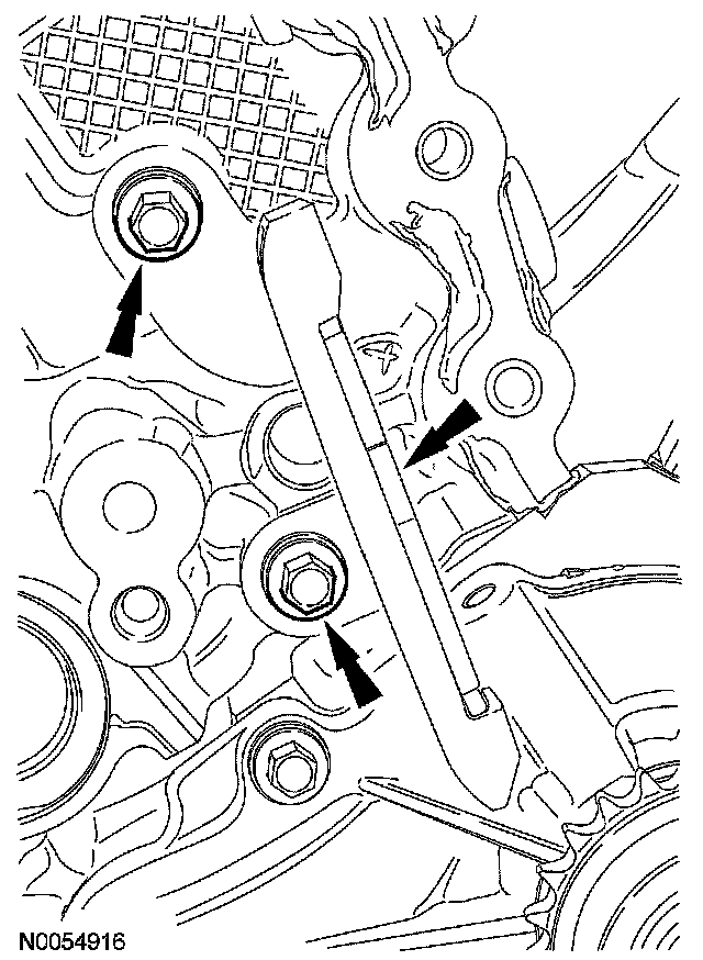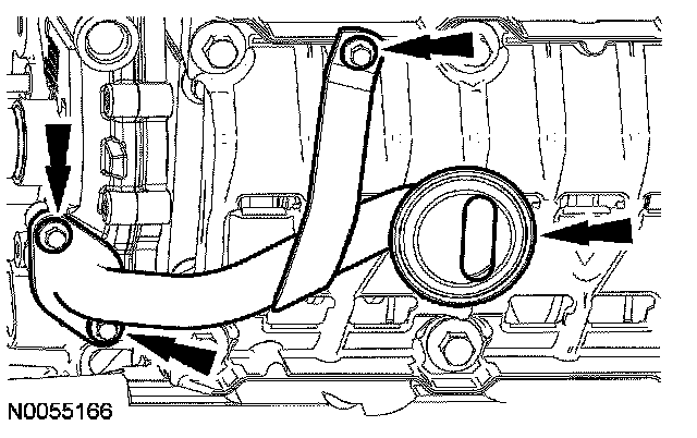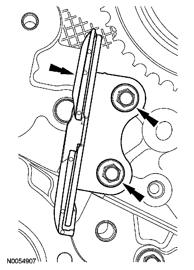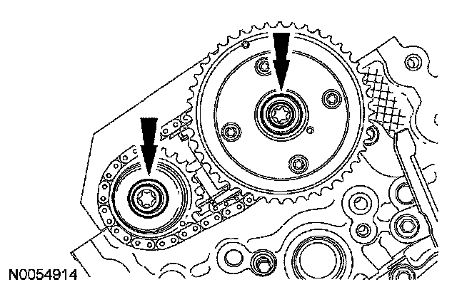 105. NOTE: The VCT bolt and the exhaust camshaft bolt must be discarded and new ones installed. However, the exhaust camshaft washer is reusable.