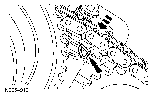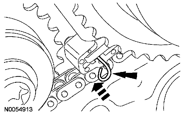104. Compress the RH secondary timing chain tensioner and install a suitable lockpin to retain the tensioner in the collapsed position.