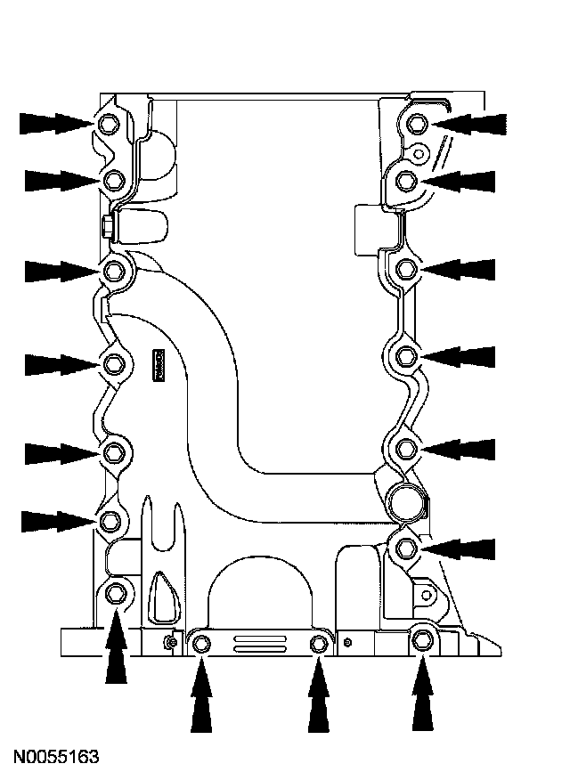 1 Alternately tighten the 2 bolts one turn at a time until the oil pan-to-cylinder block seal is released.