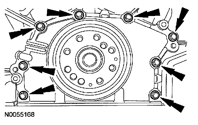 124. Remove the 8 crankshaft rear seal retainer bolts.