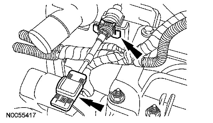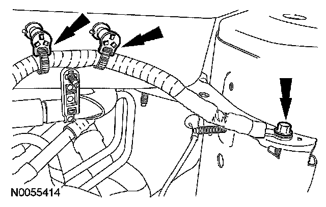 67. If equipped, attach the engine block heater harness retainers to the radiator support and the A/C suction tube.
