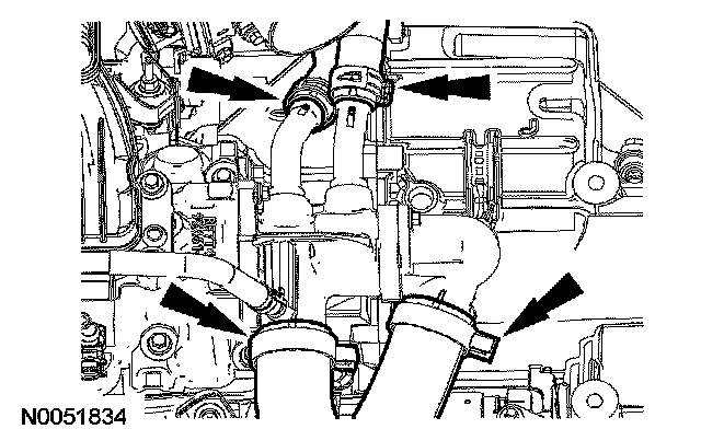 71. Connect the upper radiator hose, lower radiator hose and 2 heater hoses to the thermostat housing.