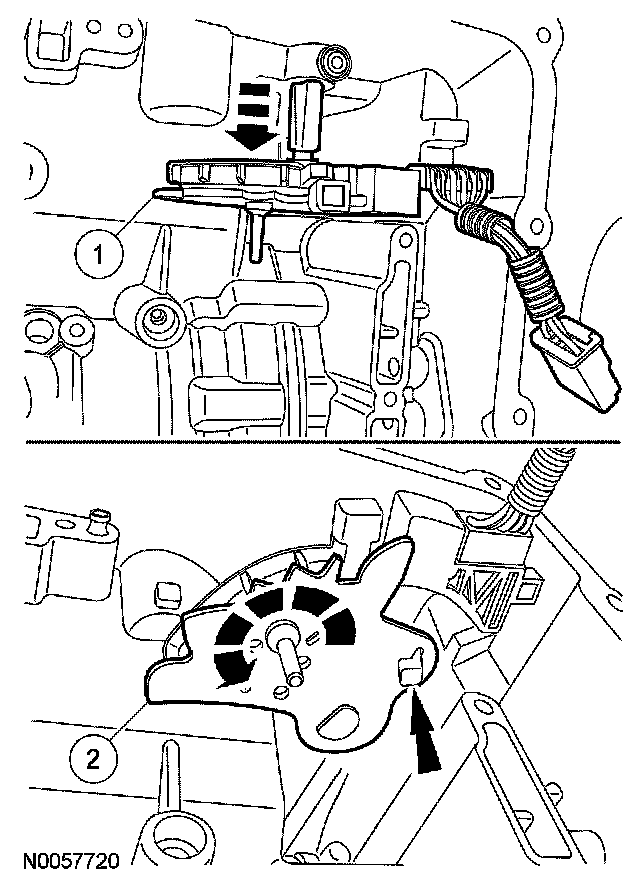 2 Rotate the TR sensor detent plate counterclockwise, as viewed from below until the plate rests against the transaxle case, remove the park pawl actuating rod from the TR sensor and remove the TR sensor.