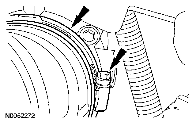 16. Inspect the transaxle case to make sure that the transmission fluid cooler tube seal and backing ring were removed with the transmission fluid cooler tube and are not stuck in the transaxle case. If the transmission fluid cooler tube seal or backing ring are stuck in the transaxle case, remove the seal and backing ring.