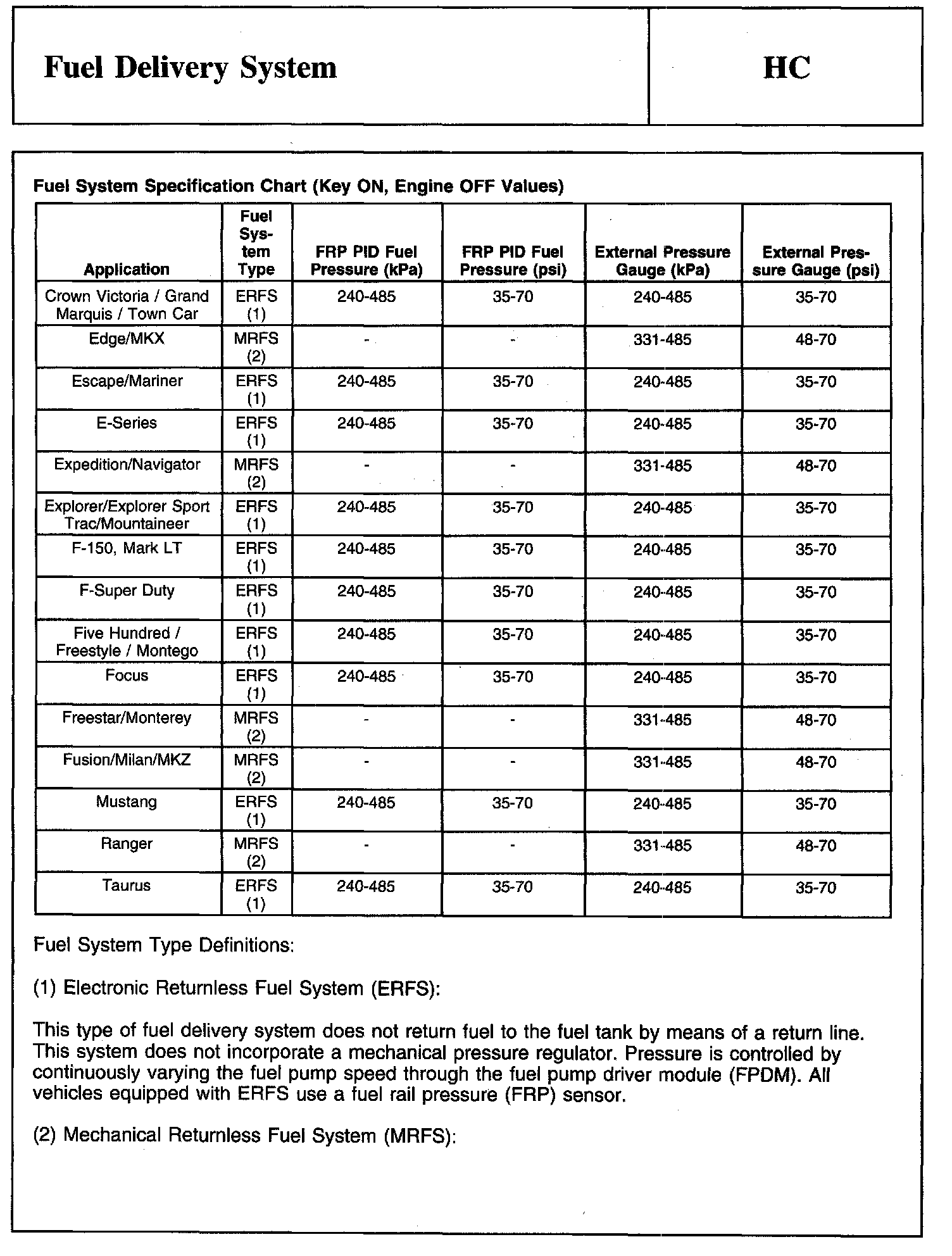 Fuel System Specification Chart: