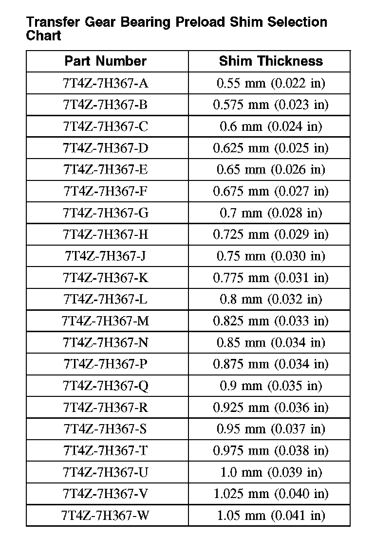 Transfer Gear Bearing Preload Shim Selection Chart: